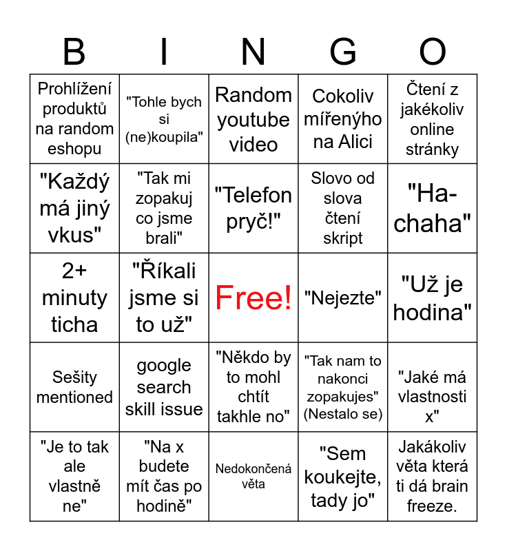 This bingo card has a free space and 24 words: "Je to tak ale vlastně ne", google search skill issue, "Telefon pryč!", "Sem koukejte, tady jo", Čtení z jakékoliv online stránky, Prohlížení produktů na random eshopu, "Tohle bych si (ne)koupila", Random youtube video, "Nejezte", "Už je hodina", 2+ minuty ticha, "Tak mi zopakuj co jsme brali", "Tak nam to nakonci zopakujes" (Nestalo se), "Jaké má vlastnosti x", "Každý má jiný vkus", "Na x budete mít čas po hodině", Nedokončená věta, Cokoliv mířenýho na Alici, "Ha-chaha", Sešity mentioned, "Říkali jsme si to už", "Někdo by to mohl chtít takhle no", Slovo od slova čtení skript and Jakákoliv věta která ti dá brain freeze..