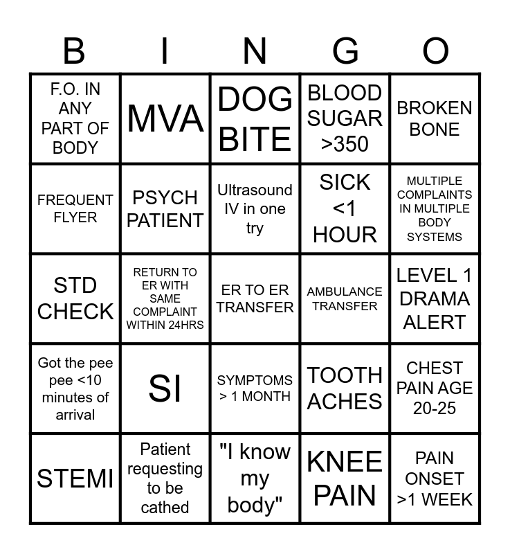 This bingo card has a free space and 24 words: STEMI, SI, Ultrasound IV in one try, KNEE PAIN, BROKEN BONE, F.O. IN ANY PART OF BODY, MVA, DOG BITE, AMBULANCE TRANSFER, LEVEL 1 DRAMA ALERT, STD CHECK, PSYCH PATIENT, TOOTH ACHES, CHEST PAIN AGE 20-25, FREQUENT FLYER, Patient requesting to be cathed, "I know my body", BLOOD SUGAR >350, MULTIPLE COMPLAINTS IN MULTIPLE BODY SYSTEMS, Got the pee pee <10 minutes of arrival, RETURN TO ER WITH SAME COMPLAINT WITHIN 24HRS, SYMPTOMS > 1 MONTH, SICK <1 HOUR and PAIN ONSET >1 WEEK.