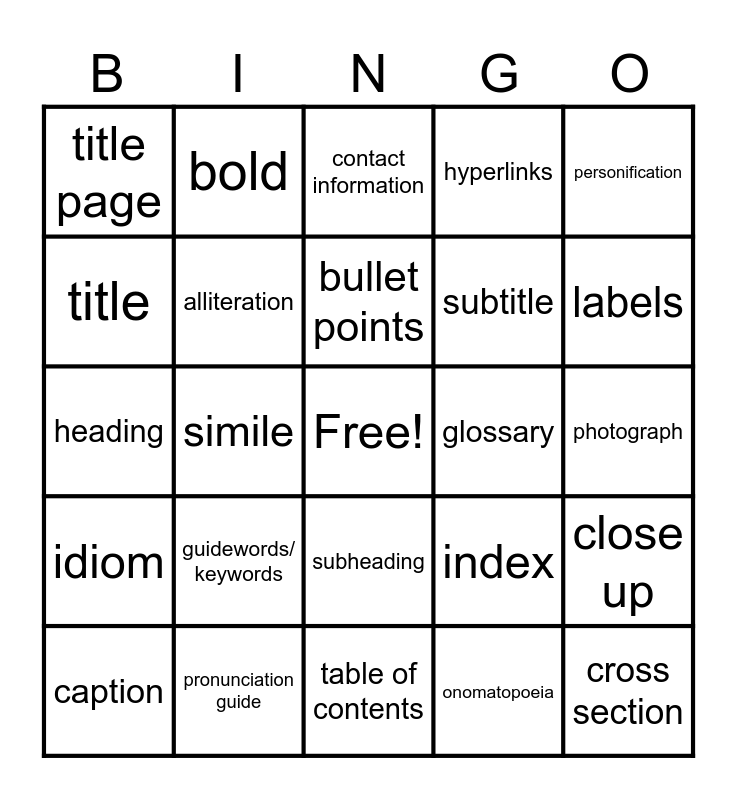 This bingo card has a free space and 32 words: onomatopoeia, hyperbole, simile, metaphor, idiom, alliteration, personification, close up, bold, italics, bullet points, contact information, illustration, sidebar, glossary, charts/graphs, caption, heading, subheading, guidewords/ keywords, index, map, photograph, pronunciation guide, cross section, hyperlinks, subtitle, title, title page, table of contents, timeline and labels.