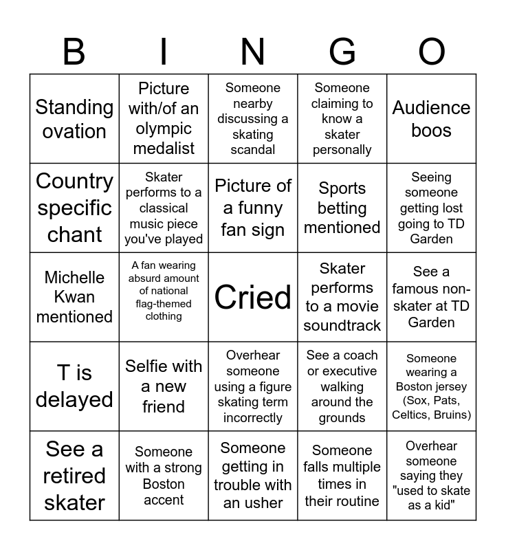 This bingo card has a free space and 24 words: See a retired skater, Selfie with a new friend, Picture of a funny fan sign, Someone falls multiple times in their routine, Audience boos, Standing ovation, Picture with/of an olympic medalist, Someone nearby discussing a skating scandal, Skater performs to a movie soundtrack, See a famous non-skater at TD Garden, Michelle Kwan mentioned, Skater performs to a classical music piece you've played, See a coach or executive walking around the grounds, Someone wearing a Boston jersey (Sox, Pats, Celtics, Bruins), Country specific chant, Someone with a strong Boston accent, Someone getting in trouble with an usher, Someone claiming to know a skater personally, Seeing someone getting lost going to TD Garden, T is delayed, A fan wearing absurd amount of national flag-themed clothing, Overhear someone using a figure skating term incorrectly, Sports betting mentioned and Overhear someone saying they "used to skate as a kid".