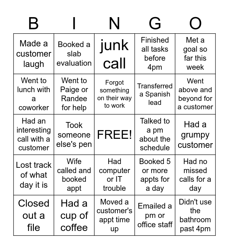 This bingo card has a free space and 24 words: Wife called and booked appt, Had a cup of coffee, Forgot something on their way to work, Closed out a file, Met a goal so far this week, Made a customer laugh, Went to lunch with a coworker, Booked a slab evaluation, Talked to a pm about the schedule, Had computer or IT trouble, Transferred a Spanish lead, Had an interesting call with a customer, Booked 5 or more appts for a day, Had no missed calls for a day, Went to Paige or Randee for help, Emailed a pm or office staff, Had a grumpy customer, junk call, Went above and beyond for a customer, Took someone else's pen, Didn't use the bathroom past 4pm, Lost track of what day it is, Finished all tasks before 4pm and Moved a customer's appt time up.