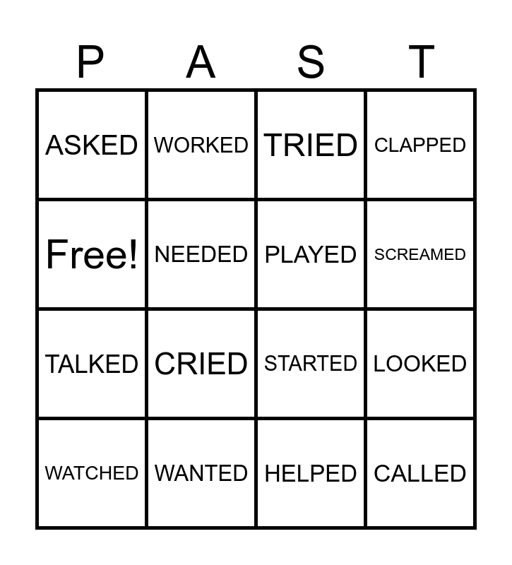 This bingo card has 16 words: WANTED, LOOKED, TRIED, ASKED, TALKED, WORKED, STARTED, HELPED, Free!, NEEDED, WATCHED, CLAPPED, CRIED, SCREAMED, PLAYED and CALLED.