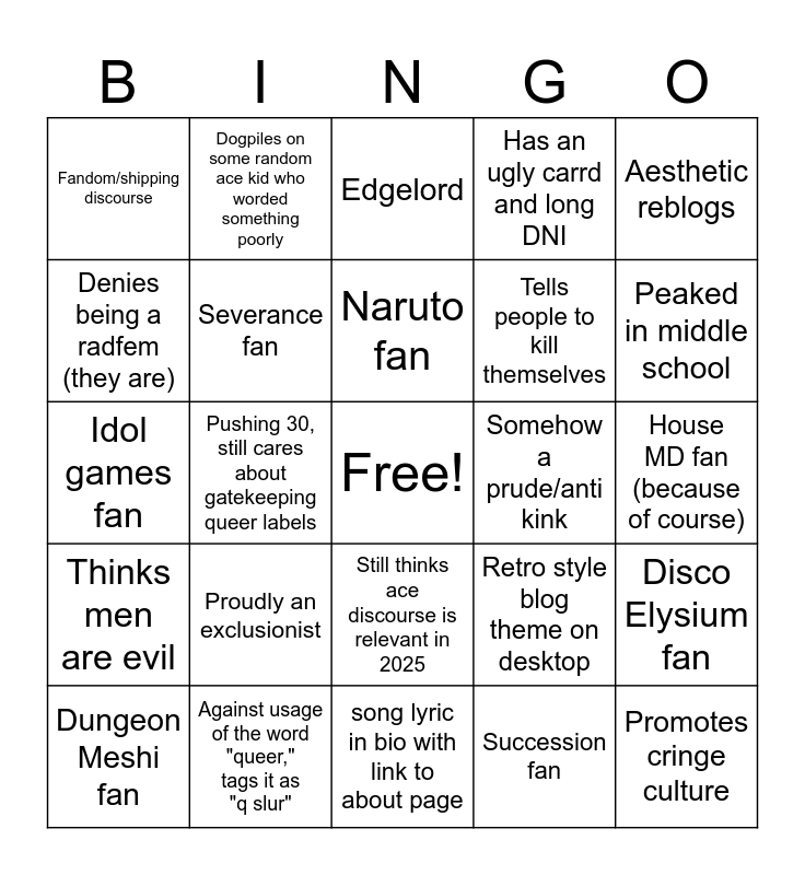 This bingo card has a free space and 24 words: Proudly an exclusionist, Against usage of the word "queer," tags it as "q slur", Naruto fan, Dungeon Meshi fan, Aesthetic reblogs, Fandom/shipping discourse, Denies being a radfem (they are), Dogpiles on some random ace kid who worded something poorly, Somehow a prude/anti kink, Still thinks ace discourse is relevant in 2025, Tells people to kill themselves, Idol games fan, Retro style blog theme on desktop, Disco Elysium fan, Severance fan, Succession fan, House MD fan (because of course), Edgelord, Peaked in middle school, Pushing 30, still cares about gatekeeping queer labels, Promotes cringe culture, Thinks men are evil, Has an ugly carrd and long DNI and song lyric in bio with link to about page.