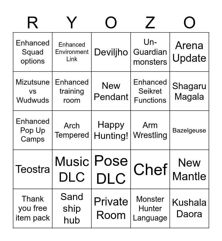 This bingo card has a free space and 24 words: Music DLC, Sand ship hub, New Pendant, Thank you free item pack, Arena Update, Enhanced Squad options, Mizutsune vs Wudwuds, Enhanced Environment Link, Arm Wrestling, Pose DLC, Enhanced Seikret Functions, Enhanced Pop Up Camps, Chef, New Mantle, Enhanced training room, Monster Hunter Language, Bazelgeuse, Deviljho, Shagaru Magala, Arch Tempered, Kushala Daora, Teostra, Un-Guardian monsters and Private Room.