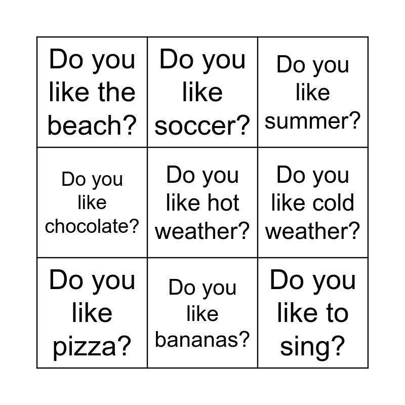 This bingo card has 9 words: Do you like pizza?, Do you like summer?, Do you like soccer?, Do you like chocolate?, Do you like the beach?, Do you like cold weather?, Do you like hot weather?, Do you like to sing? and Do you like bananas?.