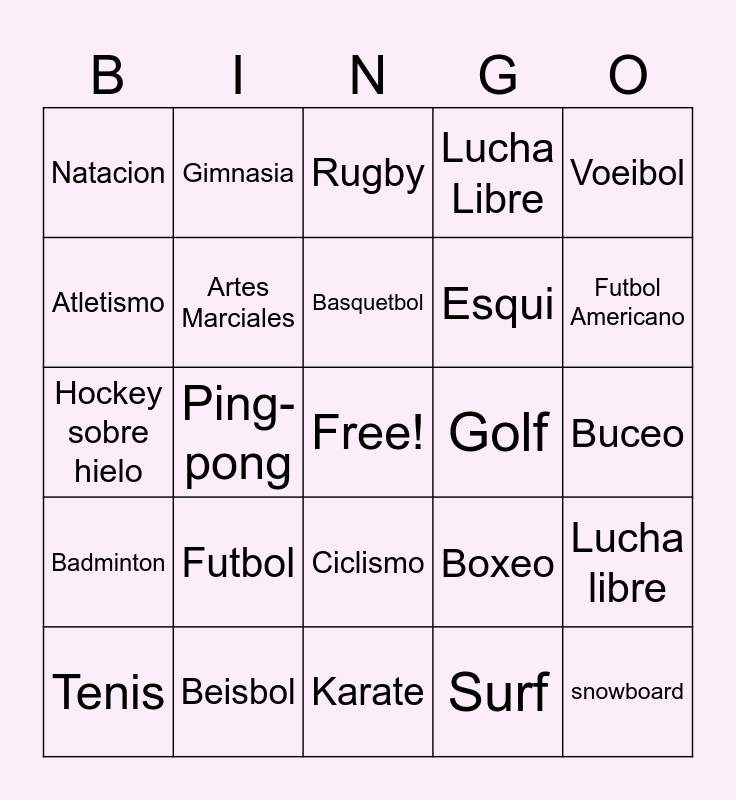 This bingo card has a free space and 24 words: Futbol, Beisbol, Basquetbol, Tenis, Voeibol, Natacion, Atletismo, Gimnasia, Golf, Ciclismo, Esqui, Hockey sobre hielo, Boxeo, Lucha libre, Artes Marciales, Surf, Buceo, Rugby, Futbol Americano, Ping-pong, snowboard, Badminton, Lucha Libre and Karate.