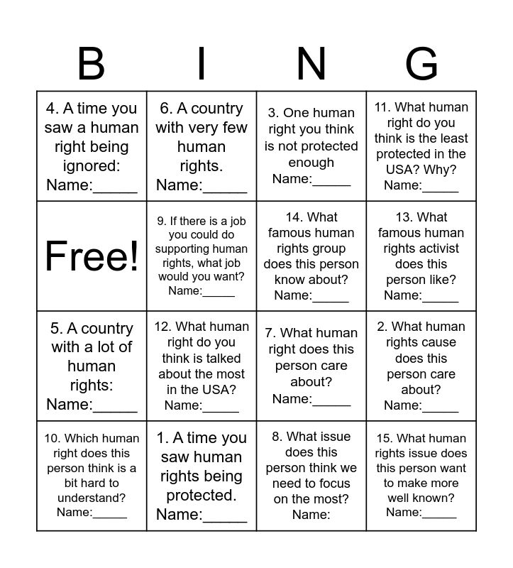 This bingo card has 16 words: 1. A time you saw human rights being protected. Name:_____, 2. What human rights cause does this person care about? Name:_____, 3. One human right you think is not protected enough Name:_____, 4. A time you saw a human right being ignored: Name:_____, 5. A country with a lot of human rights: Name:_____, 6. A country with very few human rights. Name:_____, 7. What human right does this person care about? Name:_____, 8. What issue does this person think we need to focus on the most? Name:, Free!, 9. If there is a job you could do supporting human rights, what job would you want? Name:_____, 10. Which human right does this person think is a bit hard to understand? Name:_____, 11. What human right do you think is the least protected in the USA? Why? Name:_____, 12. What human right do you think is talked about the most in the USA? Name:_____, 13. What famous human rights activist does this person like? Name:_____, 14. What famous human rights group does this person know about? Name:_____ and 15. What human rights issue does this person want to make more well known? Name:_____.