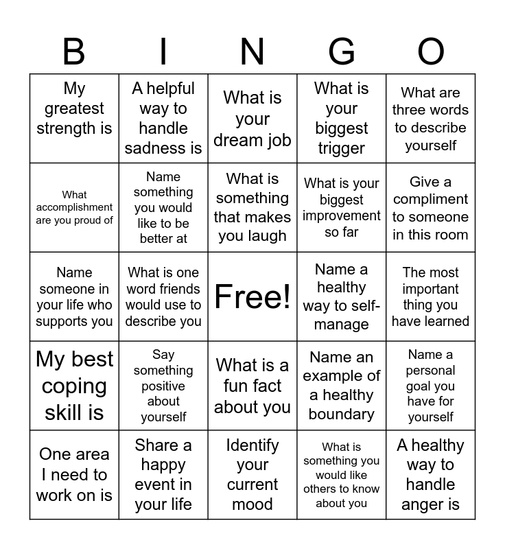 This bingo card has a free space and 24 words: Say something positive about yourself, Share a happy event in your life, What is something that makes you laugh, One area I need to work on is, What are three words to describe yourself, My greatest strength is, What accomplishment are you proud of, A helpful way to handle sadness is, Name a healthy way to self-manage, What is a fun fact about you, What is your biggest improvement so far, Name someone in your life who supports you, Name an example of a healthy boundary, Name a personal goal you have for yourself, Name something you would like to be better at, What is something you would like others to know about you, The most important thing you have learned, What is your dream job, Give a compliment to someone in this room, What is one word friends would use to describe you, A healthy way to handle anger is, My best coping skill is, What is your biggest trigger and Identify your current mood.