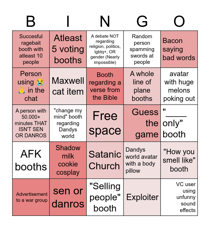 This bingo card has a free space and 24 words: Shadow milk cookie cosplay, sen or danros, Booth regarding a verse from the Bible, Advertisement to a war group, Bacon saying bad words, Succesful ragebait booth with atleast 10 people, Person using 😭🙏 in the chat, Atleast 5 voting booths, Guess the game, Satanic Church, A whole line of plane booths, A person with 50.000+ minutes THAT ISN'T SEN OR DANROS, Dandys world avatar with a body pillow, "How you smell like" booth, Maxwell cat item, Exploiter, "____ only" booth, A debate NOT regarding religion, politics, lgbtq+, OR gender (Nearly impossible), avatar with huge melons poking out, "change my mind" booth regarding Dandys world, VC user using unfunny sound effects, AFK booths, Random person spamming swords at people and "Selling people" booth.