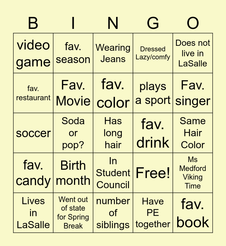 This bingo card has 25 words: Birth month, number of siblings, fav. color, Lives in LaSalle, Does not live in LaSalle, video game, fav. restaurant, fav. season, fav. drink, In Student Council, plays a sport, soccer, Free!, Ms Medford Viking Time, Fav. Movie, fav. book, Same Hair Color, Wearing Jeans, Fav. singer, Soda or pop?, Has long hair, Went out of state for Spring Break, fav. candy, Dressed Lazy/comfy and Have PE together.