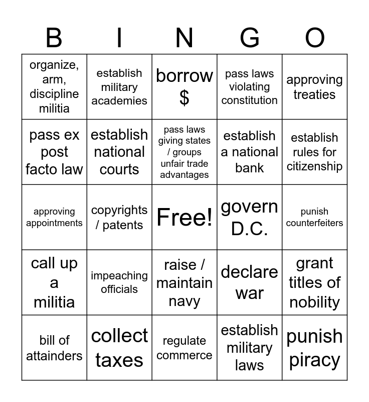 This bingo card has a free space and 30 words: collect taxes, coin / set weights & measures standards, copyrights / patents, raise / maintain army, organize, arm, discipline militia, borrow $, establish national courts, raise / maintain navy, govern D.C., regulate commerce, punish counterfeiters, punish piracy, establish military laws, make laws necessary and proper to execute powers, establish rules for citizenship, establish post office / post roads, declare war, call up a militia, impeaching officials, approving treaties, approving appointments, deciding elections, establish military academies, establish a national bank, pass ex post facto law, pass laws violating constitution, grant titles of nobility, bill of attainders, pass laws giving states / groups unfair trade advantages and spending $ not authorized by legislation.