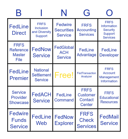 This bingo card has a free space and 24 words: FedACH Service, FedLine Web, FedGlobal ACH Service, Fedwire Funds Service, FRFS Information Security Support Services, FedLine Direct, FRFS Reference Master File, FRFS Inclusion and Diversity Support, FedTransaction Analyzer, FedLine Command, FedLine Advantage, FedLine Premier, FRFS Customer Contact Center, FRFS Educational Resources, FedNow Service, FRFS Check Services, FRFS Account Management Information, Fedwire Securities Service, FedLine Developer, National Settlement Service, FedMail Service, Service Provider Showcase, FRFS Accounting Services and FedNow Explorer.