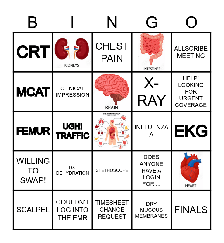 This bingo card has 5 images, a free space and 24 words: SCALPEL, EMR, UGH! TRAFFIC, TACHYCARDOA, CRT, CHEST PAIN, CLINICAL IMPRESSION, DX: DEHYDRATION, INFLUENZA A, COULDN'T LOG INTO THE EMR, EKG, FINALS, TIMESHEET CHANGE REQUEST, DRY MUCOUS MEMBRANES, HELP! LOOKING FOR URGENT COVERAGE, UNAVAILABILITY, STETHOSCOPE, WILLING TO SWAP!, ALLSCRIBE MEETING, FEMUR, DOES ANYONE HAVE A LOGIN FOR...., IV FLUIDS, X-RAY and MCAT.