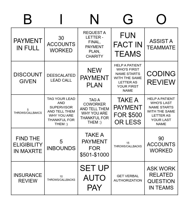 This bingo card has a free space and 24 words: 5 INBOUNDS, 10 THROWS/CALLBACKS, NEW PAYMENT PLAN, INSURANCE REVIEW, ASSIST A TEAMMATE, PAYMENT IN FULL, DISCOUNT GIVEN, 30 ACCOUNTS WORKED, TAKE A PAYMENT FOR $500 OR LESS, TAKE A PAYMENT FOR $501-$1000, HELP A PATIENT WHO'S FIRST NAME STARTS WITH THE SAME LETTER AS YOUR FIRST NAME, 5 THROWS/CALLBAKCS, 15 THROWS/CALLBACKS, 90 ACCOUNTS WORKED, DEESCALATED LEAD CALL, GET VERBAL AUTHORIZATION, HELP A PATIENT WHO'S LAST NAME STARTS WITH THE SAME LETTER AS YOUR LAST NAME, REQUEST A LETTER - FINAL, PAYMENT PLAN, CHARITY, CODING REVIEW, TAG YOUR LEAD AND SUPERVISOR AND TELL THEM WHY YOU ARE THANKFUL FOR THEM :), ASK WORK RELATED QUESTION IN TEAMS, FIND THE ELIGIBILITY IN MAXRTE, FUN FACT IN TEAMS and SET UP AUTO PAY.