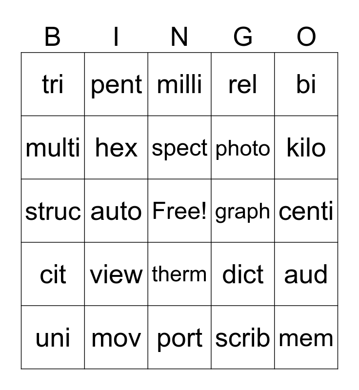 This bingo card has a free space and 25 words: view, port, spect, uni, bi, tri, multi, pent, graph, therm, photo, struc, dict, aud, hex, oct, centi, milli, kilo, auto, mem, mov, cit, rel and scrib.