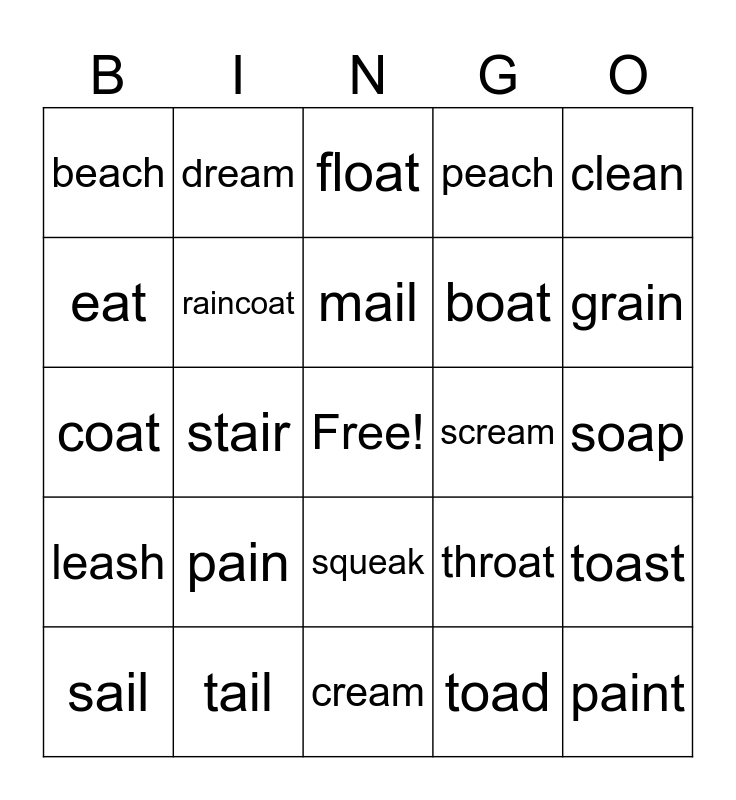 This bingo card has a free space and 24 words: pain, tail, mail, sail, clean, beach, eat, dream, scream, squeak, boat, coat, throat, toast, raincoat, toad, soap, float, grain, stair, paint, leash, peach and cream.