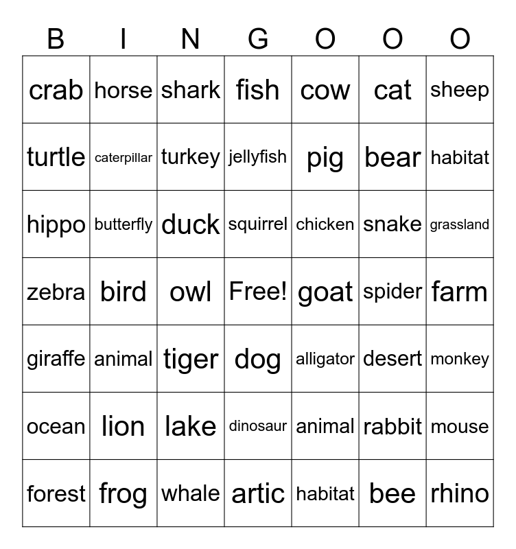 This bingo card has a free space and 48 words: animal, bear, artic, bird, duck, farm, horse, frog, cat, dog, sheep, fish, snake, chicken, ocean, spider, turtle, habitat, rabbit, cow, pig, owl, crab, caterpillar, mouse, turkey, grassland, forest, squirrel, butterfly, bee, goat, monkey, lion, zebra, alligator, desert, hippo, tiger, lake, giraffe, rhino, shark, whale, jellyfish, dinosaur, animal and habitat.