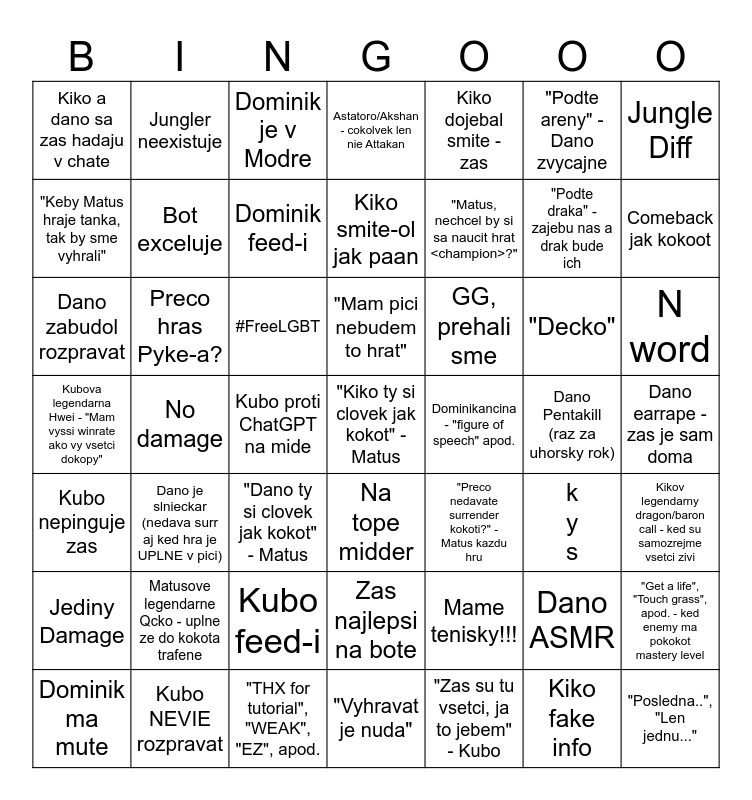 This bingo card has 49 words: Jediny Damage, Preco hras Pyke-a?, Kubo feed-i, Na tope midder, GG, prehali sme, Dano Pentakill (raz za uhorsky rok), Jungle Diff, Dominik ma mute, Bot exceluje, Kubo proti ChatGPT na mide, Kiko smite-ol jak paan, Kiko dojebal smite - zas, "Podte draka" - zajebu nas a drak bude ich, N word, Kubo nepinguje zas, Dano je slnieckar (nedava surr aj ked hra je UPLNE v pici), Dominik je v Modre, "Mam pici nebudem to hrat", "Zas su tu vsetci, ja to jebem" - Kubo, "Podte areny" - Dano zvycajne, Comeback jak kokoot, "Keby Matus hraje tanka, tak by sme vyhrali", Jungler neexistuje, Dominik feed-i, "Vyhravat je nuda", "Matus, nechcel by si sa naucit hrat <champion>?", "Decko", "Get a life", "Touch grass", apod. - ked enemy ma pokokot mastery level, Kiko a dano sa zas hadaju v chate, No damage, "THX for tutorial", "WEAK", "EZ", apod., Zas najlepsi na bote, "Preco nedavate surrender kokoti?" - Matus kazdu hru, Dano ASMR, Dano earrape - zas je sam doma, Kubova legendarna Hwei - "Mam vyssi winrate ako vy vsetci dokopy", Matusove legendarne Qcko - uplne ze do kokota trafene, "Dano ty si clovek jak kokot" - Matus, "Kiko ty si clovek jak kokot" - Matus, Dominikancina - "figure of speech" apod., Kiko fake info, Kikov legendarny dragon/baron call - ked su samozrejme vsetci zivi, Dano zabudol rozpravat, Kubo NEVIE rozpravat, #FreeLGBT, Astatoro/Akshan - cokolvek len nie Attakan, Mame tenisky!!!, k y s and "Posledna..", "Len jednu...".