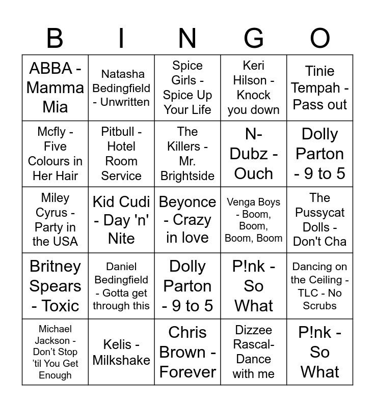 ⚠ This card has duplicate items: ABBA - Dancing Queen (2), Nelly - Hot in herre (2), Whitney Houston - I Wanna Dance with Somebody (2), Dolly Parton - 9 to 5 (2), Neil Diamond - Sweet Caroline (2), Michael Jackson - Don’t Stop ’til You Get Enough (2), Spice Girls - Spice Up Your Life (2), Girls Aloud - Sound of the Underground (2), The Pussycat Dolls - Don't Cha (2), Fergie - Glamorous (2), Usher - OMG (2), Kid Cudi - Day 'n' Nite (2), The Killers - Mr. Brightside (2), Estelle - American Boy (2), Rizzle Kicks - Down With the Trumpets (2), Pitbull - Hotel Room Service (2), Justin Bieber - Baby (2), Gwen Stefani - Hollaback Girl (2), Lady Gaga - Poker Face (2), Craig David - 7 days (2), Sean Paul - Temperature (2), S Club 7 - Don’t Stop Movin’ (2), Steps - 5, 6, 7, 8 (2), Venga Boys - Boom, Boom, Boom, Boom (2), Peter Andre - Mysterious Girl (2), Mcfly - Five Colours in Her Hair (2), Sugababes - Push the Button (2), Nicki Minaj - Super Bass (2), Jason Derulo - Whatcha Say (2), Shaggy - It Wasn’t Me (2)