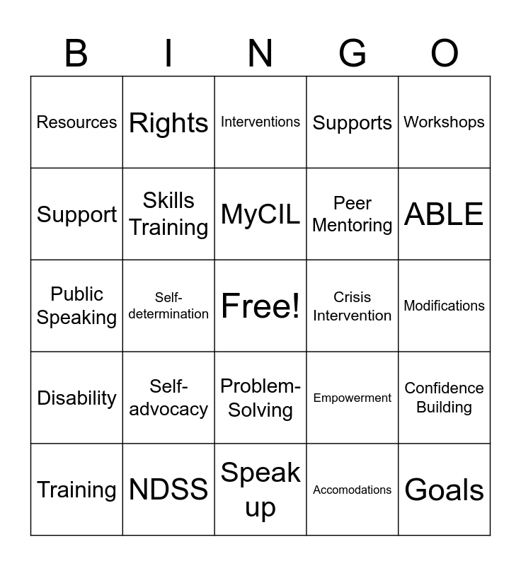 This bingo card has a free space and 24 words: Self-advocacy, NDSS, MyCIL, Training, Workshops, Resources, Support, Rights, Crisis Intervention, Problem-Solving, Peer Mentoring, Public Speaking, Empowerment, Confidence Building, Skills Training, Accomodations, Modifications, Interventions, ABLE, Self-determination, Goals, Disability, Supports and Speak up.