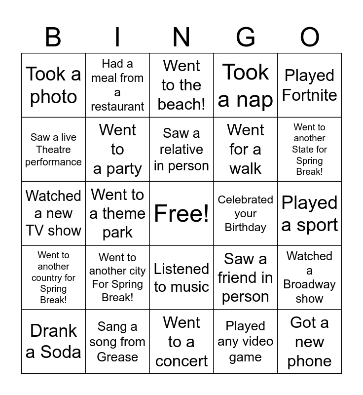 This bingo card has a free space and 24 words: Went to another city For Spring Break!, Sang a song from Grease, Saw a relative in person, Drank a Soda, Played Fortnite, Took a photo, Saw a live Theatre performance, Had a meal from a restaurant, Celebrated your Birthday, Listened to music, Went for a walk, Watched a new TV show, Saw a friend in person, Watched a Broadway show, Went to a party, Played any video game, Played a sport, Went to the beach!, Went to another State for Spring Break!, Went to a theme park, Got a new phone, Went to another country for Spring Break!, Took a nap and Went to a concert.