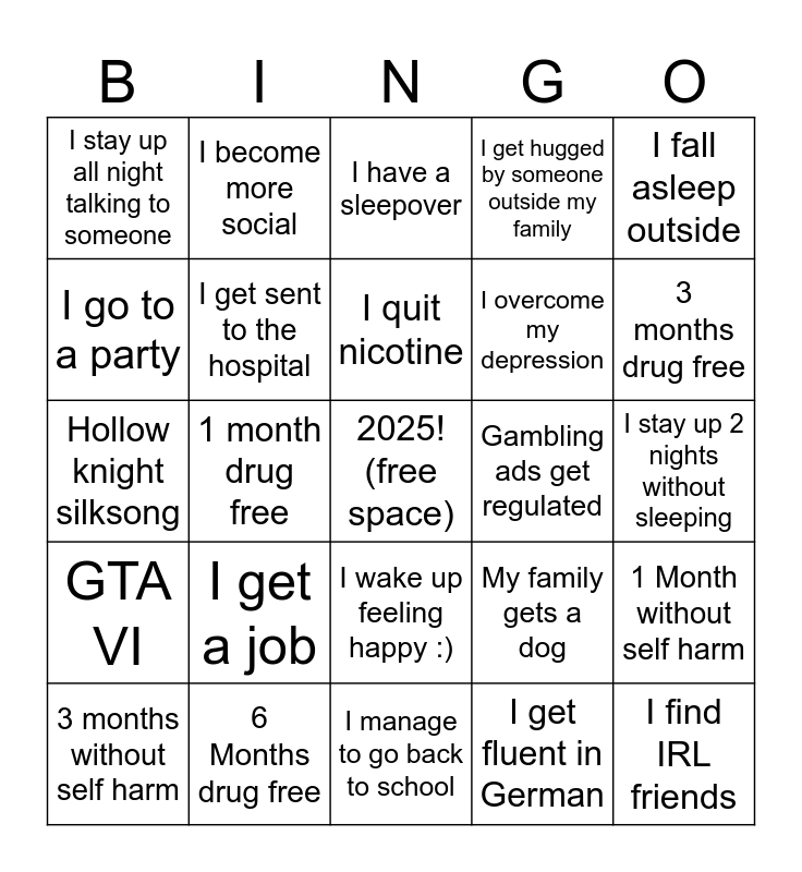 This bingo card has a free space and 24 words: I get a job, 6 Months drug free, I quit nicotine, 3 months without self harm, I fall asleep outside, I stay up all night talking to someone, I go to a party, I become more social, Gambling ads get regulated, I wake up feeling happy :), I overcome my depression, Hollow knight silksong, My family gets a dog, 1 Month without self harm, I get sent to the hospital, I get fluent in German, I stay up 2 nights without sleeping, I have a sleepover, 3 months drug free, 1 month drug free, I find IRL friends, GTA VI, I get hugged by someone outside my family and I manage to go back to school.