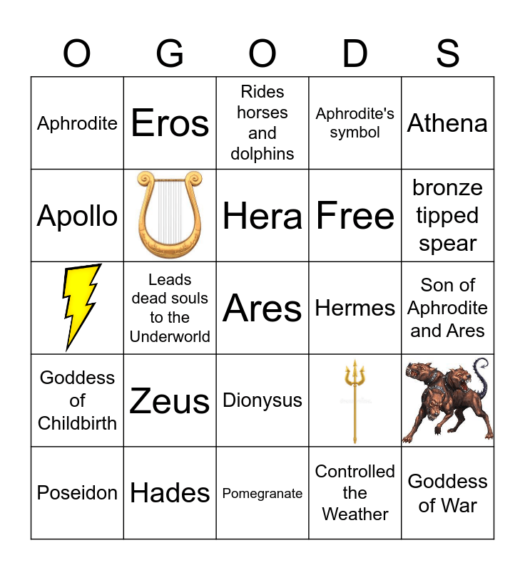 This bingo card has 4 images, a free space and 20 words: Zeus, Hades, Hera, Poseidon, Athena, Aphrodite, Apollo, Eros, Hermes, Dionysus, Free, Controlled the Weather, Son of Aphrodite and Ares, Rides horses and dolphins, bronze tipped spear, Leads dead souls to the Underworld, Goddess of War, Goddess of Childbirth, Aphrodite's symbol and Pomegranate.