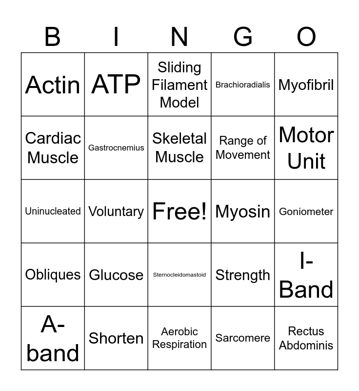 This bingo card has a free space and 35 words: Flexor, Extensor, Biceps Brachii, Gastrocnemius, Sternocleidomastoid, Brachioradialis, Cardiac Muscle, Smooth Muscle, Skeletal Muscle, Striated, Uninucleated, Myofibril, Fascicle, Epimysium, Actin, Myosin, Sarcomere, Voluntary, Obliques, Rectus Abdominis, Strength, A-band, I-Band, Shorten, Sliding Filament Model, Motor Unit, Origin, Insertion, Range of Movement, Goniometer, Anaerobic Respiration, Aerobic Respiration, Glucose, ATP and Z line.