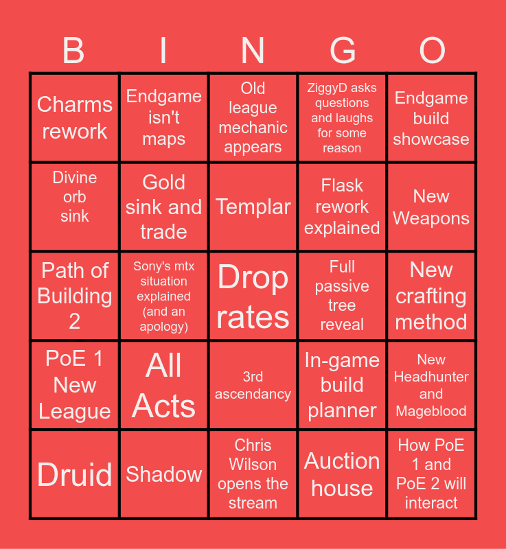 This bingo card has a free space and 24 words: All Acts, Shadow, Templar, Druid, Endgame build showcase, Charms rework, Divine orb sink, Endgame isn't maps, Full passive tree reveal, 3rd ascendancy, Flask rework explained, Path of Building 2, In-game build planner, New Headhunter and Mageblood, Gold sink and trade, Auction house, New crafting method, Old league mechanic appears, New Weapons, Sony's mtx situation explained (and an apology), How PoE 1 and PoE 2 will interact, PoE 1 New League, ZiggyD asks questions and laughs for some reason and Chris Wilson opens the stream.
