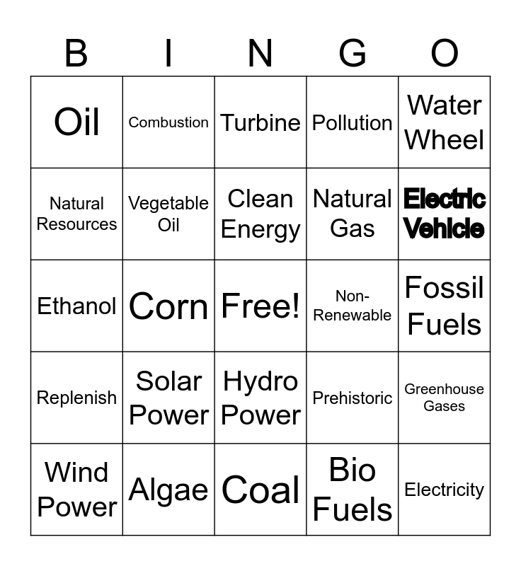 This bingo card has a free space and 29 words: Wind Power, Renewable, Corn, Nuclear Power, Oil, Turbine, Vegetable Oil, Solar Power, Non- Renewable, Algae, Fossil Fuels, Electricity, Coal, Bio Fuels, Electric Vehicle, Geothermal Energy, Hydro Power, Replenish, Water Wheel, Ethanol, Prehistoric, Biodiesel, Natural Gas, Natural Resources, Pollution, Combustion, Greenhouse Gases, Clean Energy and Deplete.