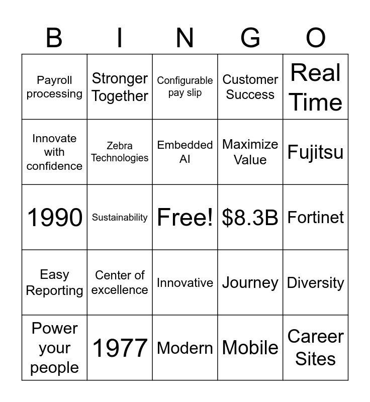 This bingo card has a free space and 31 words: Modern, Culture, Sustainability, Customer Connection, Payroll processing, Configurable pay slip, Zebra Technologies, Journey, $8.3B, Mobile, Fortinet, Career Sites, Gartner, Community Giving, Fujitsu, Grow, Diversity, Center of excellence, Easy Reporting, Innovative, Real Time, Transformation, Power your people, Stronger Together, Maximize Value, Innovate with confidence, Customer Success, 1990, 1977, Embedded AI and AI Agent Studio.