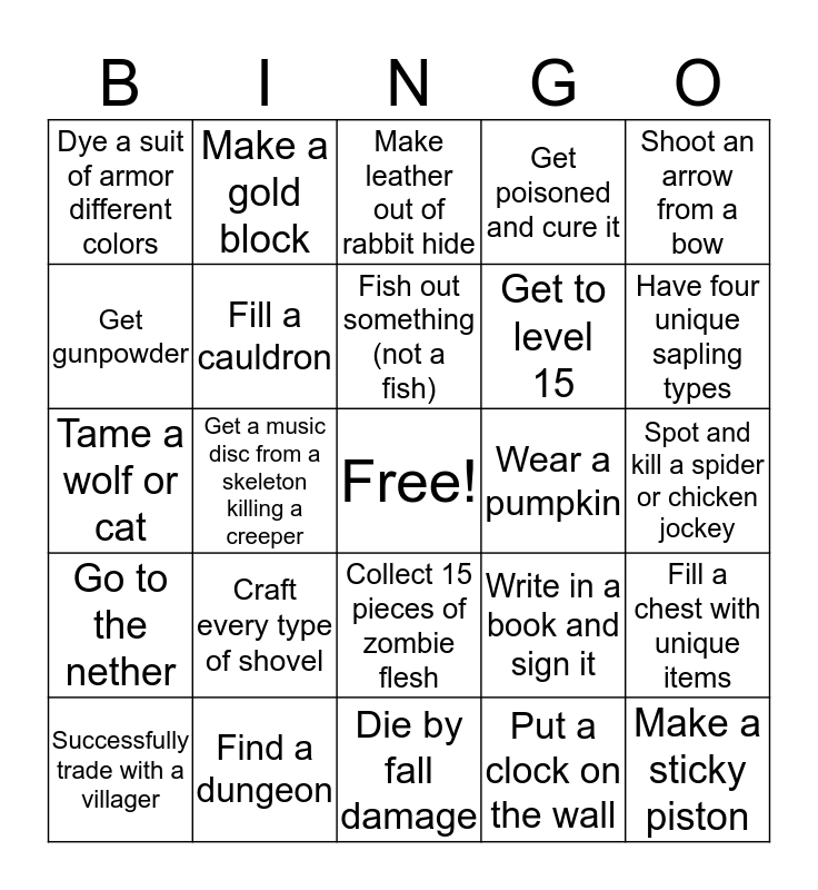 This bingo card has a free space and 25 words: Craft every type of shovel, Die by fall damage, Fish out something (not a fish), Successfully trade with a villager, Shoot an arrow from a bow, Dye a suit of armor different colors, Get gunpowder, Make a gold block, Wear a pumpkin, Collect 15 pieces of zombie flesh, Get to level 15, Tame a wolf or cat, Write in a book and sign it, Fill a chest with unique items, Fill a cauldron, Craft an anvil, Spot and kill a spider or chicken jockey, Make leather out of rabbit hide, Have four unique sapling types, Get a music disc from a skeleton killing a creeper, Make a sticky piston, Find a dungeon, Go to the nether, Get poisoned and cure it and Put a clock on the wall.