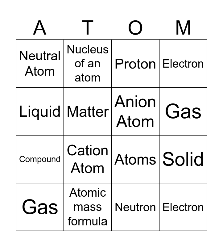 This bingo card has 20 words: Solid, Mixture, Proton, Element, Gas, Liquid, Atomic mass formula, Neutral Atom, Compound, Nucleus of an atom, Cation Atom, Atoms, Matter, Electron, Anion Atom, Neutron, Gas, Electron, Neutron and Atomic Mass Formula.