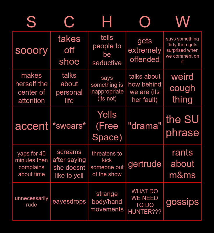 This bingo card has a free space and 32 words: WHAT DO WE NEED TO DO HUNTER???, SHUT UP! yes i said it 😡, *swears*, Singles out Blake or Peter, yaps for 40 minutes then complains about time, talks about personal life, says something dirty then gets surprised when we comment on it, rants about m&ms, takes off shoe, cone of shame!, says something is inappropriate (its not), tells people to be seductive, manhandles someone, starts crying, "drama", showmance / canoodling, unnecessarily rude, accent, threatens to kick someone out of the show, screams after saying she doesnt like to yell, gertrude, group chat rant, the SU phrase, eavesdrops, gossips, gets extremely offended, talks about how behind we are (its her fault), makes herself the center of attention, sooory, strange body/hand movements, PROJECTION / ARTICULATION and weird cough thing.