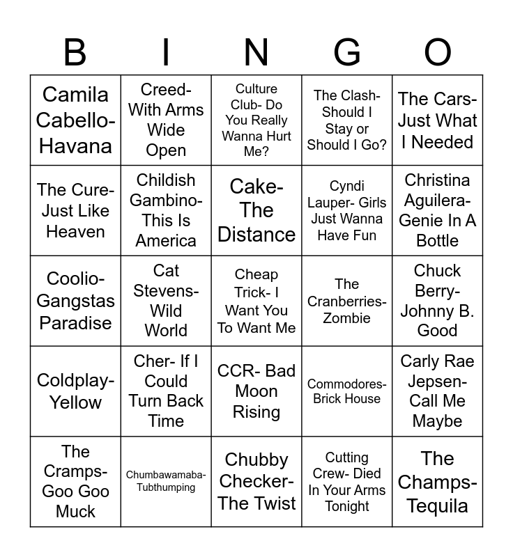 This bingo card has 28 words: Carly Rae Jepsen- Call Me Maybe, The Chicks- Goodbye Earl, Cyndi Lauper- Girls Just Wanna Have Fun, Cutting Crew- Died In Your Arms Tonight, The Cure- Just Like Heaven, Culture Club- Do You Really Wanna Hurt Me?, Creed- With Arms Wide Open, Coldplay- Yellow, The Cranberries- Zombie, The Cramps- Goo Goo Muck, Coolio- Gangstas Paradise, The Clash- Should I Stay or Should I Go?, Chumbawamaba- Tubthumping, Chubby Checker- The Twist, Christina Aguilera- Genie In A Bottle, Cee Lo Green- Crazy, Cher- If I Could Turn Back Time, Childish Gambino- This Is America, Cake- The Distance, CCR- Bad Moon Rising, Camila Cabello- Havana, The Champs- Tequila, Cheap Trick- I Want You To Want Me, Cat Stevens- Wild World, Chuck Berry- Johnny B. Good, Commodores- Brick House, The Cars- Just What I Needed and Counting Crews- Mr. Jones.