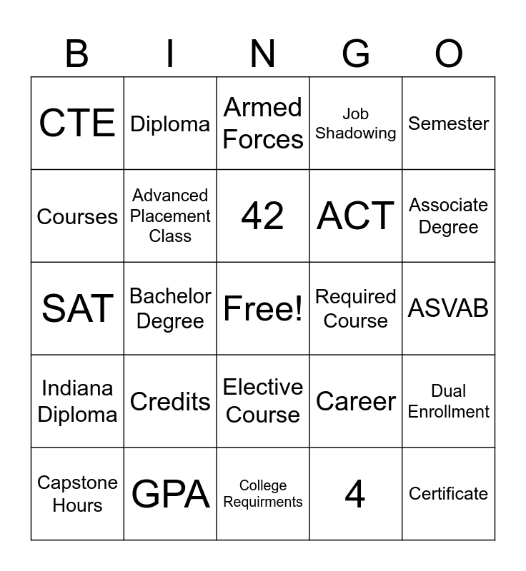 This bingo card has a free space and 24 words: Credits, GPA, 42, Capstone Hours, Semester, CTE, Courses, Diploma, Required Course, Elective Course, ACT, SAT, Career, Dual Enrollment, Advanced Placement Class, 4, ASVAB, Armed Forces, Associate Degree, Bachelor Degree, Certificate, Indiana Diploma, Job Shadowing and College Requirments.