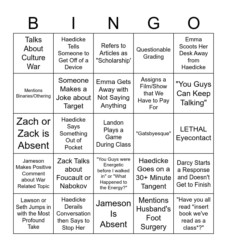 This bingo card has a free space and 24 words: Zack Talks about Foucault or Nabokov, Haedicke Derails Conversation then Says to Stop Her, Emma Gets Away with Not Saying Anything, Lawson or Seth Jumps in with the Most Profound Take, Emma Scoots Her Desk Away from Haedicke, Talks About Culture War, Mentions Binaries/Othering, Haedicke Tells Someone to Get Off of a Device, "Gatsbyesque", "You Guys were Energetic before I walked in" or "What Happened to the Energy?", Assigns a Film/Show that We Have to Pay For, Zach or Zack is Absent, Haedicke Goes on a 30+ Minute Tangent, Darcy Starts a Response and Doesn't Get to Finish, Someone Makes a Joke about Target, Mentions Husband's Foot Surgery, LETHAL Eyecontact, Refers to Articles as "Scholarship', "You Guys Can Keep Talking", Haedicke Says Something Out of Pocket, "Have you all read *insert book we've read as a class*?", Jameson Makes Positive Comment about War Related Topic, Questionable Grading and Jameson Is Absent.