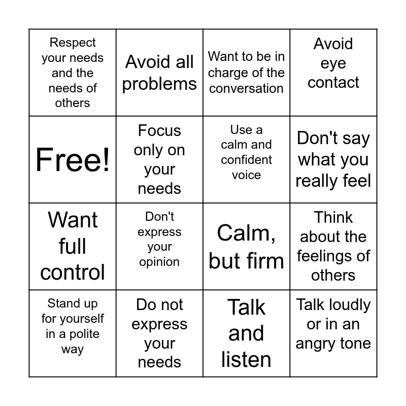This bingo card has 16 words: Do not express your needs, Think about the feelings of others, Want to be in charge of the conversation, Respect your needs and the needs of others, Want full control, Avoid all problems, Calm, but firm, Talk and listen, Free!, Focus only on your needs, Stand up for yourself in a polite way, Avoid eye contact, Don't express your opinion, Don't say what you really feel, Use a calm and confident voice and Talk loudly or in an angry tone.