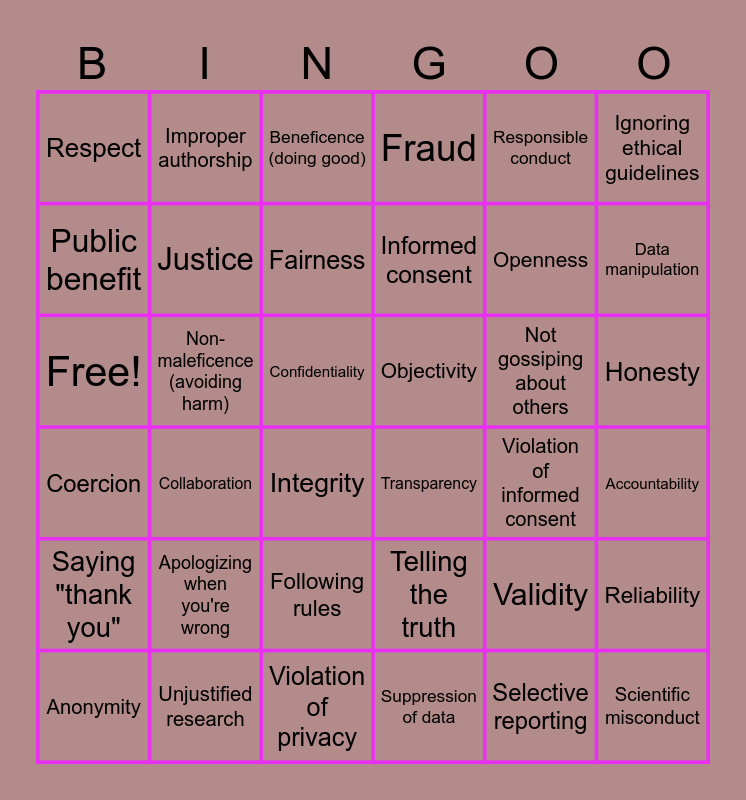 This bingo card has 36 words: Telling the truth, Following rules, Suppression of data, Public benefit, Coercion, Objectivity, Justice, Violation of privacy, Responsible conduct, Validity, Data manipulation, Fraud, Reliability, Non-maleficence (avoiding harm), Informed consent, Respect, Saying "thank you", Not gossiping about others, Free!, Beneficence (doing good), Confidentiality, Collaboration, Transparency, Integrity, Violation of informed consent, Improper authorship, Openness, Unjustified research, Fairness, Ignoring ethical guidelines, Scientific misconduct, Anonymity, Accountability, Honesty, Apologizing when you're wrong and Selective reporting.