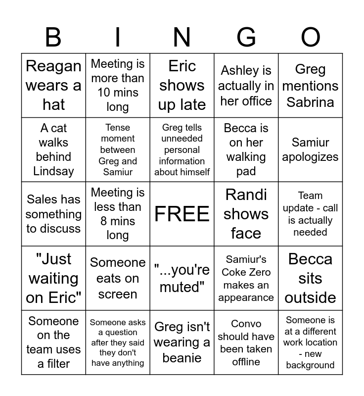 This bingo card has a free space and 33 words: Someone uses a holiday themed virtual background, "I'm good", Meeting is less than 8 mins long, "nothing from me", "Just waiting on Eric", Tense moment between Greg and Samiur, Greg mentions Sabrina, Someone on the team uses a filter, Meeting is more than 10 mins long, Greg unnecessarily answers someones question, Greg tells unneeded personal information about himself, Eric shows up late, Someones kid makes an appearance, Adam shows face, Randi shows face, Samiur apologizes, Someone asks a question after they said they don't have anything, Sales has something to discuss, Someone eats on screen, Samiur's Coke Zero makes an appearance, "...you're muted", Someones pet makes an appearance, Reagan wears a hat, Team update - call is actually needed, Greg isn't wearing a beanie, Someone is at a different work location - new background, Ashley is actually in her office, Becca is on her walking pad, A cat walks behind Lindsay, Becca sits outside, Linds is getting her house cleaned, Convo should have been taken offline and Literally no one on the team has a question.