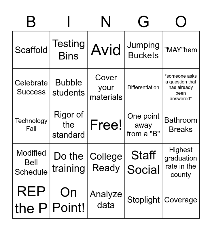This bingo card has a free space and 24 words: Do the training, On Point!, Cover your materials, REP the P, "MAY"hem, Scaffold, Celebrate Success, Testing Bins, One point away from a "B", College Ready, Differentiation, Technology Fail, Staff Social, Highest graduation rate in the county, Bubble students, Stoplight, Bathroom Breaks, Avid, *someone asks a question that has already been answered*, Rigor of the standard, Coverage, Modified Bell Schedule, Jumping Buckets and Analyze data.