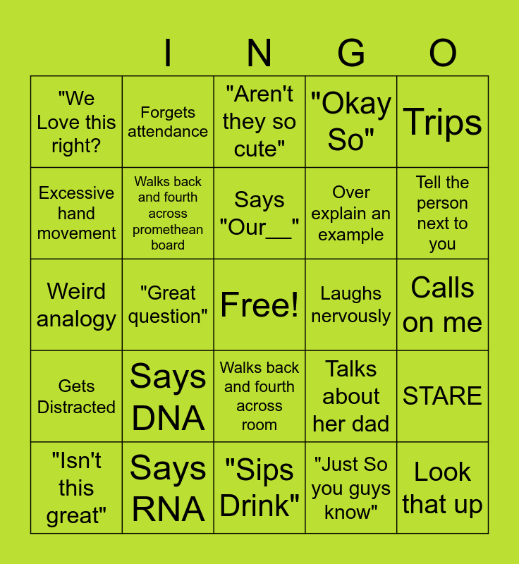 This bingo card has a free space and 24 words: Says DNA, Says RNA, Says "Our__", "Isn't this great", Trips, "We Love this right?, Excessive hand movement, Forgets attendance, Laughs nervously, Walks back and fourth across room, Over explain an example, Weird analogy, Talks about her dad, STARE, Walks back and fourth across promethean board, "Just So you guys know", Calls on me, "Aren't they so cute", Tell the person next to you, "Great question", Look that up, Gets Distracted, "Okay So" and "Sips Drink".
