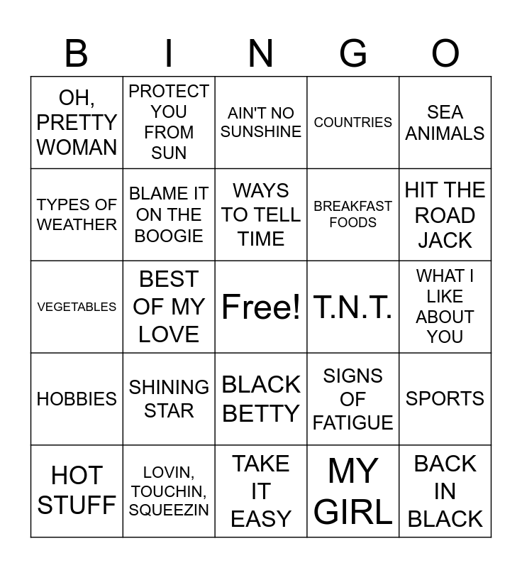 This bingo card has a free space and 29 words: HOT STUFF, YOU'RE THE ONE THAT I WANT, BEST OF MY LOVE, I WAS MADE FOR LOVIN YOU, OH, PRETTY WOMAN, AIN'T NO SUNSHINE, BLAME IT ON THE BOOGIE, SHINING STAR, T.N.T., LOVIN, TOUCHIN, SQUEEZIN, WHAT I LIKE ABOUT YOU, BACK IN BLACK, TAKE IT EASY, MY GIRL, HIT THE ROAD JACK, I GOT A WOMAN, BLACK BETTY, HOBBIES, SEA ANIMALS, VEGETABLES, SIGNS OF FATIGUE, VEHICLES, BREAKFAST FOODS, TYPES OF WEATHER, COUNTRIES, PROTECT YOU FROM SUN, SPORTS, WAYS TO TELL TIME and DESSERTS.