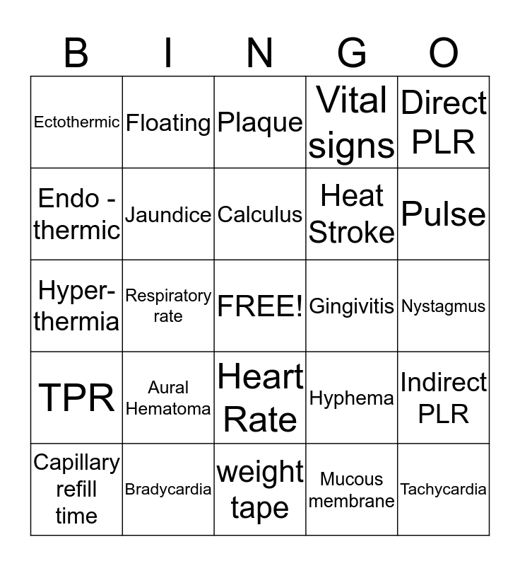 This bingo card has a free space and 24 words: Aural Hematoma, Bradycardia, Calculus, Capillary refill time, Direct PLR, Ectothermic, Endo -thermic, Floating, Gingivitis, Heart Rate, Heat Stroke, Hyper-thermia, Hyphema, Indirect PLR, Jaundice, Mucous membrane, Nystagmus, Plaque, Pulse, Respiratory rate, Tachycardia, TPR, Vital signs and weight tape.