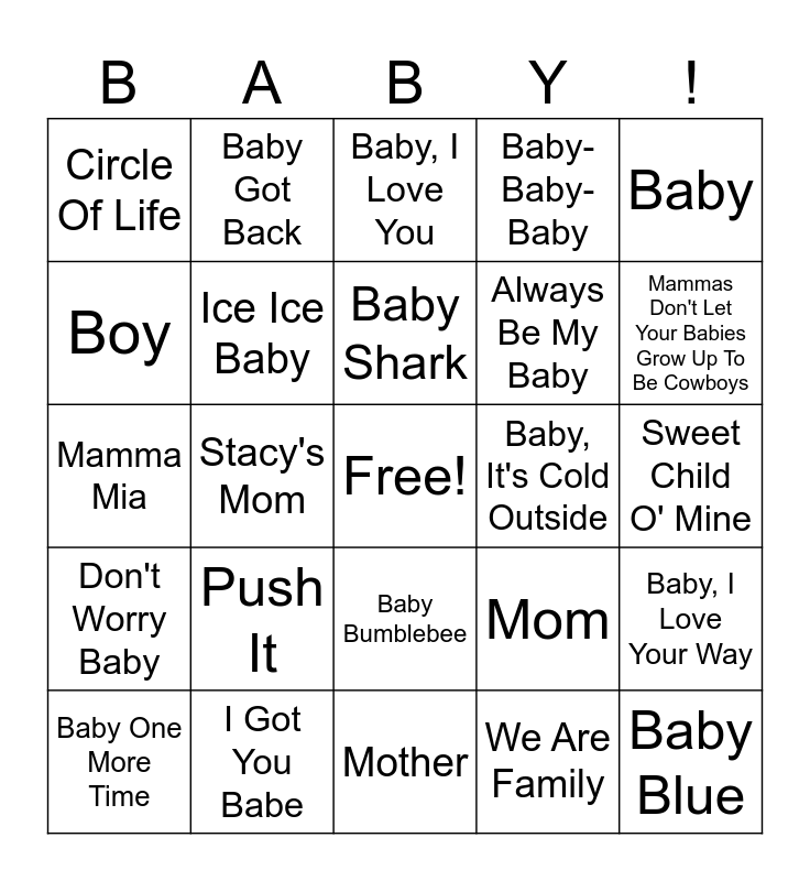 This bingo card has a free space and 24 words: Push It, I Got You Babe, Baby Shark, Baby One More Time, Baby, Circle Of Life, Boy, Baby Got Back, Baby, It's Cold Outside, Baby Bumblebee, Always Be My Baby, Mamma Mia, Mom, Baby, I Love Your Way, Ice Ice Baby, We Are Family, Sweet Child O' Mine, Baby, I Love You, Mammas Don't Let Your Babies Grow Up To Be Cowboys, Stacy's Mom, Baby Blue, Don't Worry Baby, Baby-Baby-Baby and Mother.