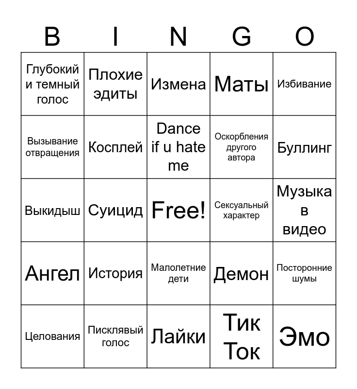 This bingo card has a free space and 24 words: История, Писклявый голос, Dance if u hate me, Целования, Избивание, Глубокий и темный голос, Вызывание отвращения, Плохие эдиты, Сексуальный характер, Малолетние дети, Оскорбления другого автора, Выкидыш, Демон, Посторонние шумы, Косплей, Тик Ток, Музыка в видео, Измена, Буллинг, Суицид, Эмо, Ангел, Маты and Лайки.