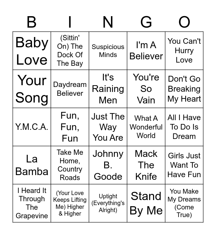 This bingo card has 90 words: (We're Gonna) Rock Around The Clock, Brandy (You're A Fine Girl), Johnny B. Goode, Theme From New York, New York, Let's Get It On, The Great Pretender, Wake Me Up Before You Go-Go, Build Me Up Buttercup, Leader Of The Pack, Lean On Me, All Shook Up, Whole Lotta Shakin' Going On, Then He Kissed Me, All I Have To Do Is Dream, Hotel California, It's Raining Men, The Tracks Of My Tears, Why Do Fools Fall In Love, September (Do You Remember), Killing Me Softly With His Song, Uptown Girl, Piano Man, Uptight (Everything's Alright), Billie Jean, Y.M.C.A., (Your Love Keeps Lifting Me) Higher & Higher, If I Could Turn Back Time, Mrs. Robinson, Joy To The World, Rocket Man, Lady Marmalade, Girls Just Want To Have Fun, I Want To Hold Your Hand, La Bamba, Baby Love, I'm A Believer, Suspicious Minds, Don't Stop Believin', Fun, Fun, Fun, Don't Go Breaking My Heart, I Heard It Through The Grapevine, Your Song, You Make Me Feel So Young, I Will Survive, It's The Same Old Song, Mack The Knife, California Dreamin', Stand By Your Man, Rhinestone Cowboy, Tequila, Yakety Yak, You're So Vain, I Wanna Dance With Somebody (Who Loves Me), Stayin' Alive, Different Drum, These Boots Are Made For Walkin', What A Wonderful World, Cupid, Bad Moon Rising, War, Jailhouse Rock, Blueberry Hill, Play That Funky Music, All Night Long, Superstition, Livin' On A Prayer, Chantilly Lace, Stand By Me, Oh, Pretty Woman, Midnight Train To Georgia, Take Me Home, Country Roads, Just The Way You Are, Brown Sugar, Sweet Caroline, (Sittin' On) The Dock Of The Bay, Daydream Believer, At The Hop, Earth Angel (Will You Be Mine), That's Amore, Saturday In The Park, You Make My Dreams (Come True), You Can't Hurry Love, We Will Rock You, I Saw Her Standing There, Son Of A Preacher Man, Don't Be Cruel, You're The First, The Last, My Everything, Beyond The Sea, Dancing Queen and Tutti Frutti.