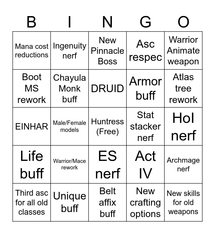 This bingo card has a free space and 24 words: Warrior/Mace rework, Unique buff, DRUID, Third asc for all old classes, Warrior Animate weapon, Mana cost reductions, Boot MS rework, Ingenuity nerf, Stat stacker nerf, ES nerf, Armor buff, EINHAR, Act IV, Archmage nerf, Chayula Monk buff, New crafting options, HoI nerf, New Pinnacle Boss, Atlas tree rework, Male/Female models, New skills for old weapons, Life buff, Asc respec and Belt affix buff.
