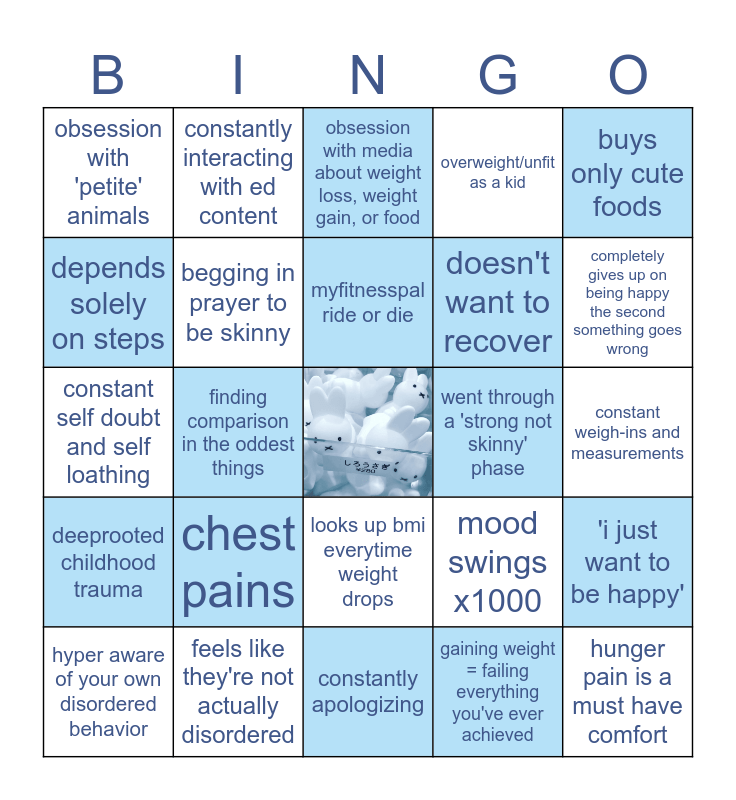 This bingo card has a free space and 24 words: chest pains, feels like they're not actually disordered, myfitnesspal ride or die, hyper aware of your own disordered behavior, buys only cute foods, obsession with 'petite' animals, depends solely on steps, constantly interacting with ed content, went through a 'strong not skinny' phase, looks up bmi everytime weight drops, doesn't want to recover, constant self doubt and self loathing, mood swings x1000, 'i just want to be happy', begging in prayer to be skinny, gaining weight = failing everything you've ever achieved, constant weigh-ins and measurements, obsession with media about weight loss, weight gain, or food, completely gives up on being happy the second something goes wrong, finding comparison in the oddest things, hunger pain is a must have comfort, deeprooted childhood trauma, overweight/unfit as a kid and constantly apologizing.