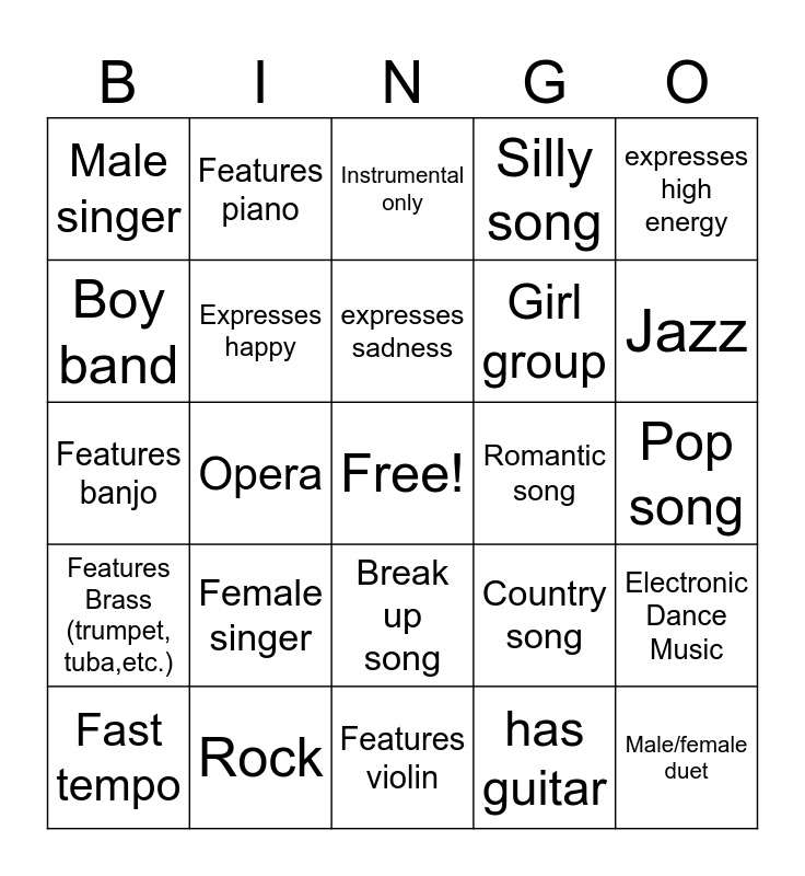This bingo card has a free space and 24 words: Fast tempo, Female singer, expresses sadness, has guitar, expresses high energy, Male singer, Features piano, Instrumental only, Romantic song, Pop song, Features banjo, Expresses happy, Country song, Electronic Dance Music, Boy band, Rock, Features violin, Silly song, Jazz, Features Brass (trumpet, tuba,etc.), Opera, Break up song, Girl group and Male/female duet.
